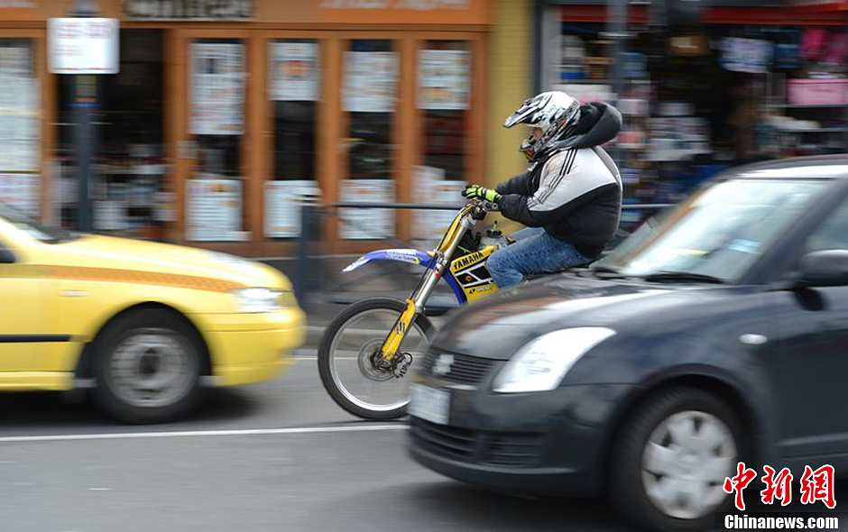 当地时间2013年8月27日,澳大利亚墨尔本,弗兰克斯顿火车站附近,警察试图让一名驾驶越野摩托车的男子在路边停下,该男子为躲避警察,横冲直撞,结果撞到了出租车上。图片来源:CFP视觉中国