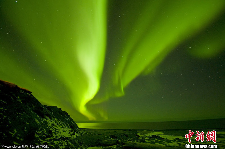 美国现罕见绿色极光