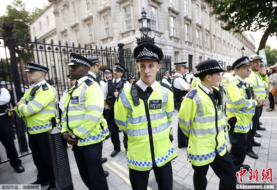 当地时间2013年8月28日,英国伦敦,示威者聚集封锁唐宁街,呼吁不要军事介入叙利亚危机。
