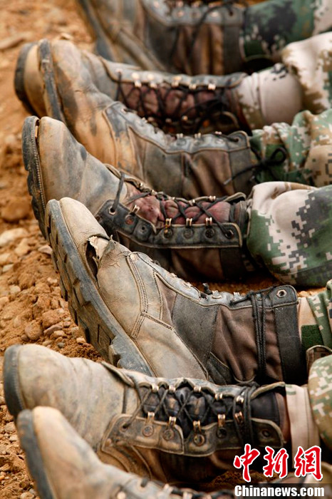 2013年8月29日,黑龙江省黑河市逊克县段洪水水位首次下降到警戒线以下,坚守在抗洪一线的黑龙江省军区某边防团官兵已经连续奋战了20多个日日夜夜,许多战士休息时才发现自己的军靴、衣服、袜子等早已磨破,战士们笑言:“这是我们最美的军功章。” 。魏建顺 摄 图片来源:CFP视觉中国
