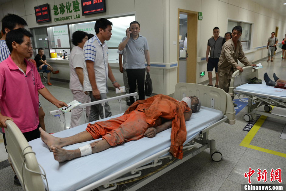 8月29日13时40分许,浙江省温州市瓯海区振凤路一幢两层房屋在装修时发生倒塌,事故造成1人死亡、3人重伤。图为伤者在医院治疗。中新社发 余根铃 摄 图片来源:CNSPHOTO