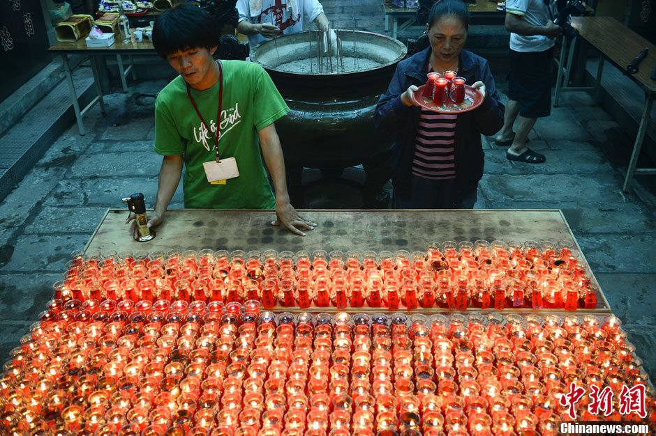 8月29日晚,台湾嘉义县大士爷庙举行年度盛事——普渡祭典。图为民众献上写有名字的许愿灯,祈求大士爷保佑家人平安健康。刘震 摄