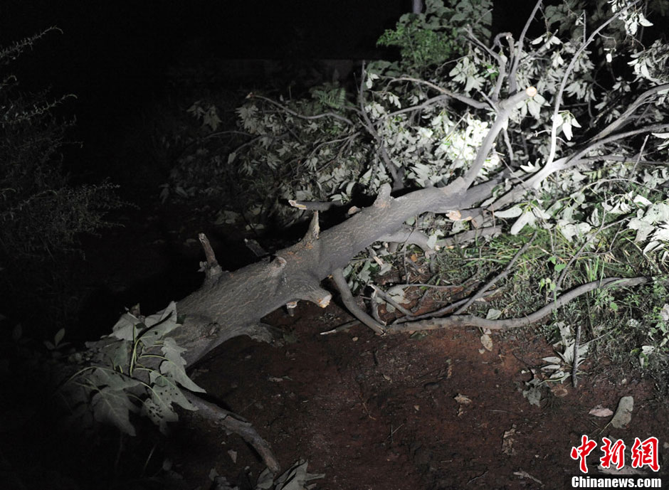 8月29日下午3时,湖南省娄底市双峰县甘棠镇发生44年一遇的特大龙卷风,导致全镇4条高压线路跳闸断电,2.2万农户停电,1000多棵大树被连根拔起,多处房屋受损,100多根电杆倒塌。图为一棵大树被龙卷风连根拔起,倒在公路上。乃继辉 摄