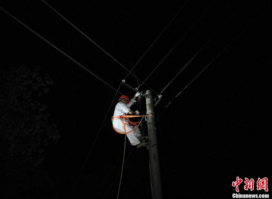8月29日下午3时,湖南省娄底市双峰县甘棠镇发生44年一遇的特大龙卷风,导致全镇4条高压线路跳闸断电,2.2万农户停电,1000多棵大树被连根拔起,多处房屋受损,100多根电杆倒塌。图为一名电力工人在和平村连夜抢修供电线路。乃继辉 摄