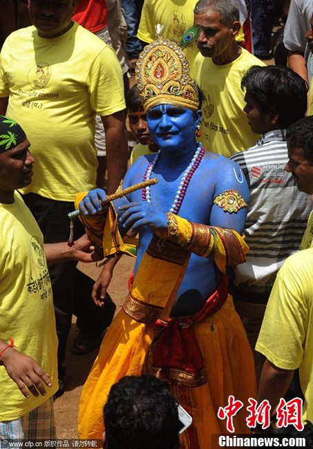 当地时间2013年8月29日,印度,建摩斯达密节期间,民众扮成克利须那神,搭人梯,庆祝克利须那神诞辰。建摩斯达密节是一年一度为纪念印度克利须那神而举办的节日。图片来源:CFP视觉中国
