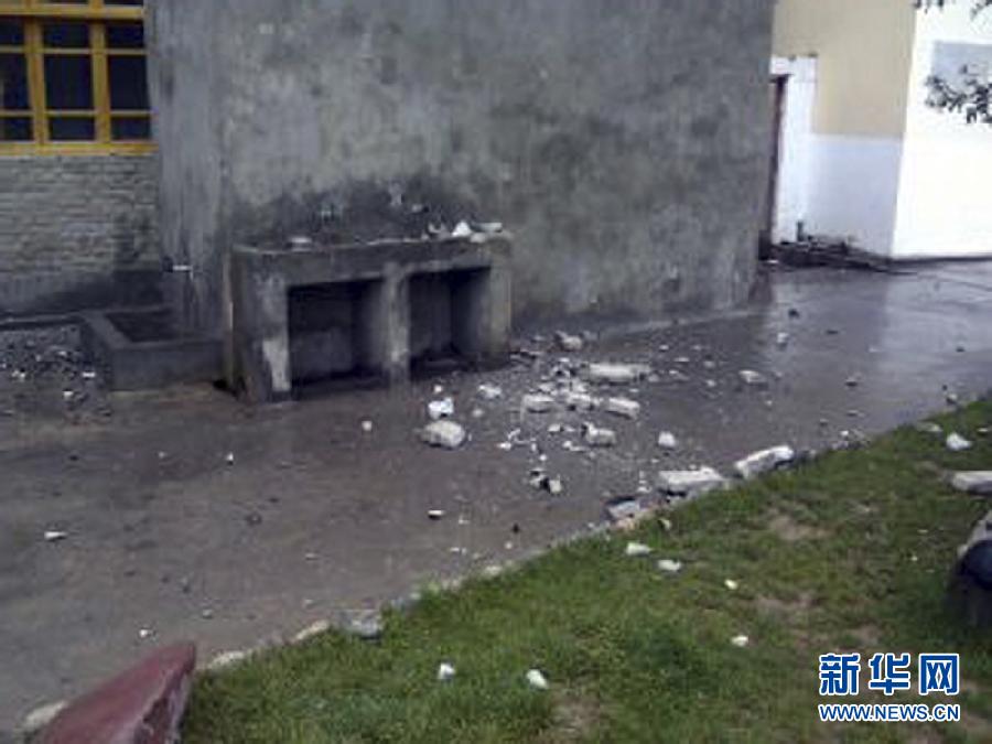 8月31日,在云南迪庆德钦县奔子栏镇,地震导致一座房屋前落下碎石(手机拍摄)。 8月31日8时4分在云南省迪庆藏族自治州香格里拉县、德钦县、四川省甘孜藏族自治州得荣县交界(北纬28.2度,东经99.4度)发生5.9级地震,震源深度10千米。王文涛 摄 图片来源:新华网