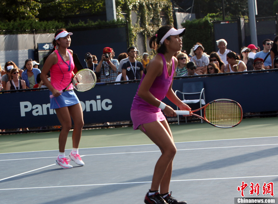 当地时间8月30日,海峡组合、新科温网女双冠军彭帅/谢淑薇以2比0力克跨国组合达尼利都/帕诺娃,顺利晋级2013年度美国网球公开赛次轮。中新社发 阮煜琳 摄