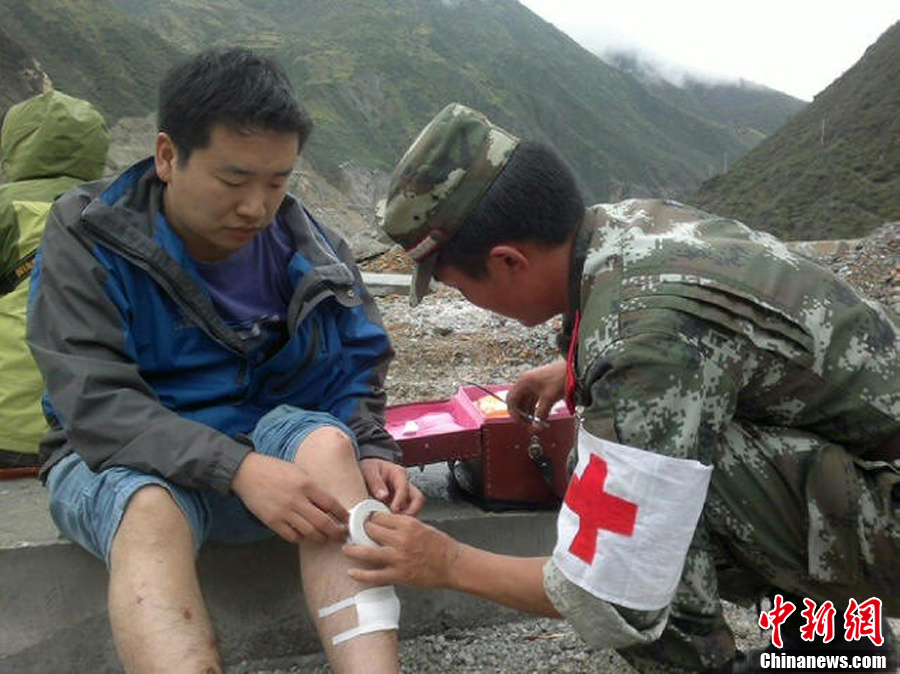 8月31日08时04分在云南省迪庆藏族自治州香格里拉县、德钦县、四川省甘孜藏族自治州得荣县交界发生5.9级地震,巴拉格宗景区附近两辆车被埋,多人受伤。赶来救援的武警8750部队官兵迅速展开施救行动。图为医疗服务队正在救治受伤人员。李世才 摄 图片来源:东方IC 版权作品 请勿转载