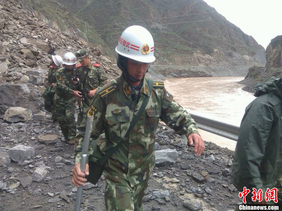 据国家地震台网自动测定,8月31日08时04分在云南省迪庆藏族自治州香格里拉县附近(北纬28.1度,东经99.4度)发生5.9级地震,震源深度10千米。图为国道214线香格里拉伏龙桥段发生垮塌,两辆重型卡车埋压,四人获救,二人死亡,武警云南总队迪庆支队参谋长带领15名突击队员强行军到地点救援。中新社发 武警云南总队迪庆支队供图