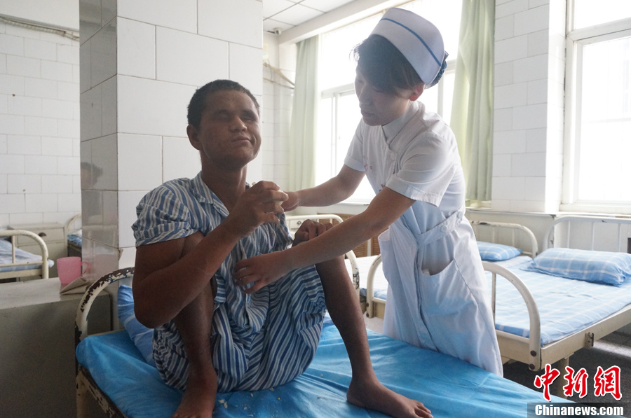 图为被接到医院治疗的程相涛,经过医生对其身体检查、擦洗并穿上病号服,开始他重回“人间”的生活。周小云 摄