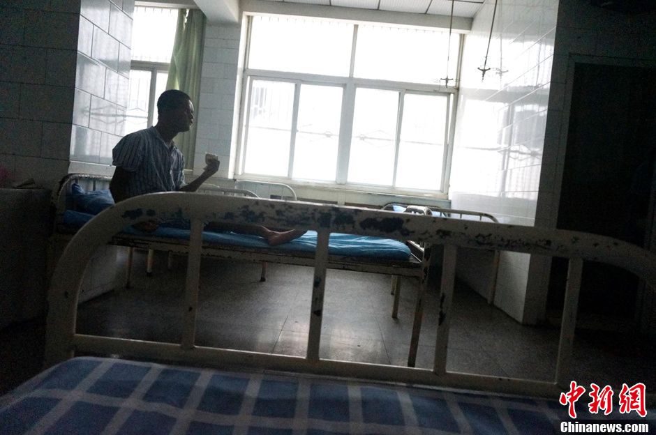 图为被接到医院治疗的程相涛,因尚不习惯周边环境,呆呆坐在病床上,时而自言自语。周小云 摄