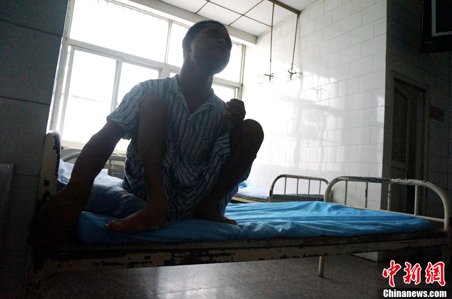 图为脱离山洞的程湘涛,很多时候,依旧静静地蜷坐着。其主治医生介绍,程湘涛双下肢轻度萎缩,这是他平日经常采取蹲姿、不常行走所导致。周小云 摄