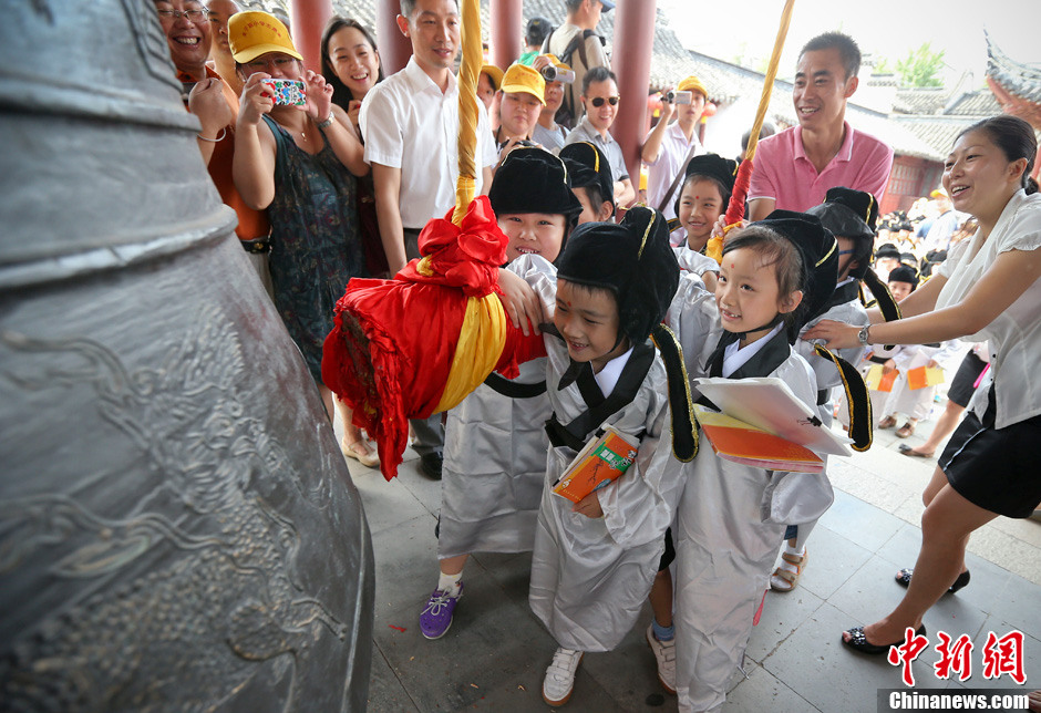 9月1日,南京夫子庙小学一年级的新生在夫子庙广场上举行“开笔破蒙”典礼,在阵阵礼乐声中,学校老师带着新同学向孔子像行礼、诵读《论语》、学写“人”字、敲启蒙钟、并按传统习俗在孩子们的额头正中点上朱砂,接受“尚礼”传统文化教育和师长祝愿,由此正式成为一名学生。中新社发 泱波 摄