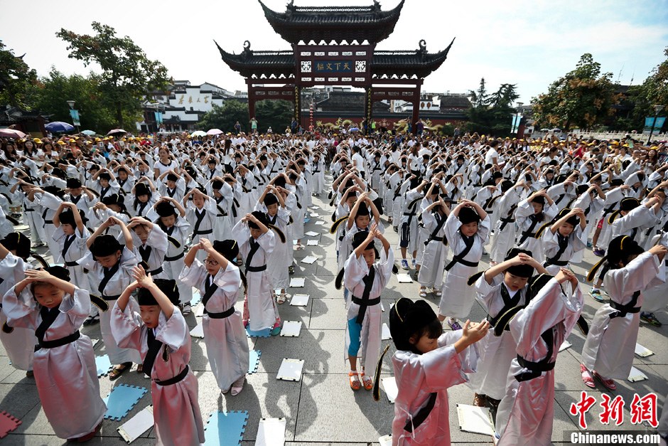 9月1日,南京夫子庙小学一年级的新生在夫子庙广场上举行“开笔破蒙”典礼,在阵阵礼乐声中,学校老师带着新同学向孔子像行礼、诵读《论语》、学写“人”字、敲启蒙钟、并按传统习俗在孩子们的额头正中点上朱砂,接受“尚礼”传统文化教育和师长祝愿,由此正式成为一名学生。中新社发 泱波 摄