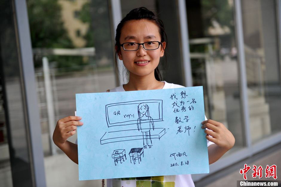 北京大学元培学院理科实验班大一新生何雨凡希望成为一名数学老师。她今年高考687分,裸分全省排名第15,其中数学考取148分,与满分仅2分之差。这名来自辽宁丹东的18岁女孩从小学开始,就特别愿意帮同学解决学习方面的问题,上高中后突然对数学产生浓厚兴趣。“我想把这两个兴趣结合在一起,做一名优秀的数学老师,将来让更多学生学好数学,希望他们能从数学方面为国家做更多贡献。”何雨凡说,具体而言,自己想当一名大学数学老师,留校执教是最理想选择。图/文 中新网记者 金硕