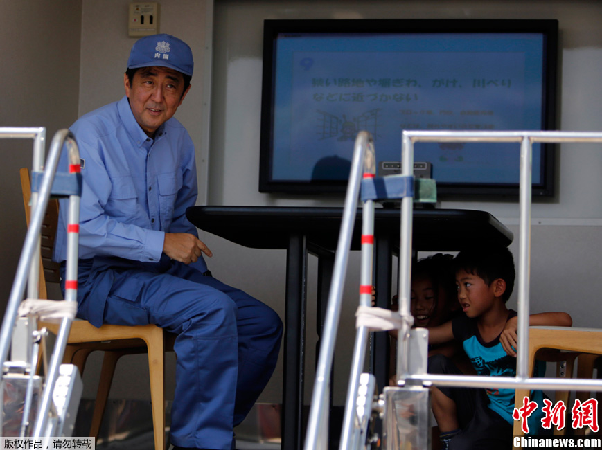 安倍视察防灾演练 与儿童一起钻桌下“避险”