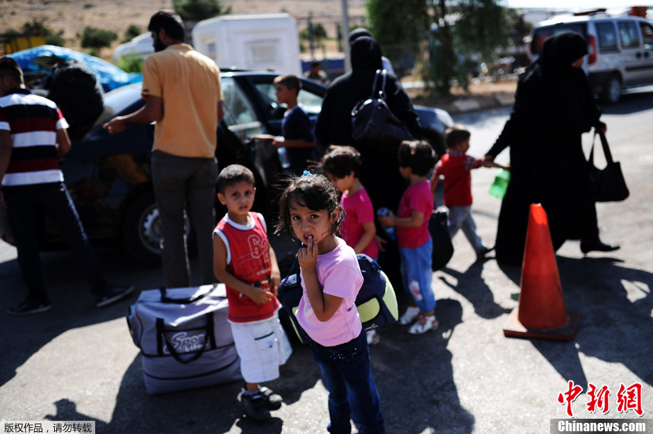 当地时间8月31日,叙利亚民众携家带子通过土叙边境进入土耳其境内。
