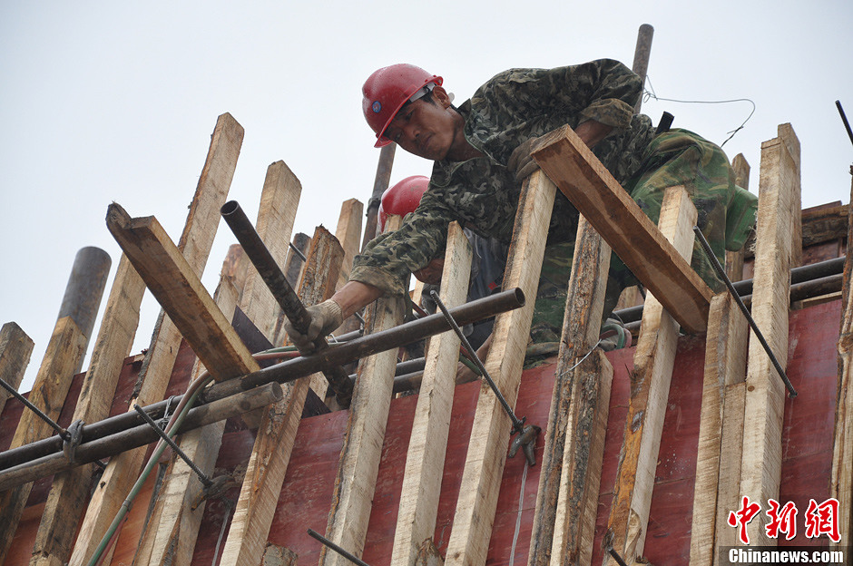 9月2日,因泥石流中断的内昆铁路恢复正常通车。8月25日, 受持续强降雨影响,内昆铁路大关至曾家坪子间发生泥石流被迫中断,千余名抢险人员连续奋战参与抢修。图为抢修工人在现场对边坡和铁路之间的混泥土挡墙进行清理。中新社发 田小川 摄