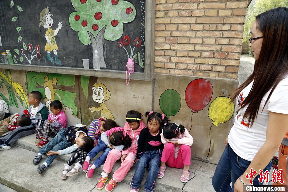 9月2日下午1点过,青海省湟中县海子沟乡王家庄幼教点的孩子们正在教室的墙根下午睡,由于没有专门的休息场所,孩子们在墙角摆出“高难度”的睡姿。老师们说,教室里阴暗潮湿,孩子午睡容易感冒,所以就在外面靠墙睡,天气好的情况下每次午睡在半小时以内。据湟中县教育局教育科分管学前教育的汪虎林介绍,目前湟中县共有68个幼教点,孩子们普遍没有午休的地方,王家庄幼教点的情况在该县“属于比较好的”。赵凛松 摄