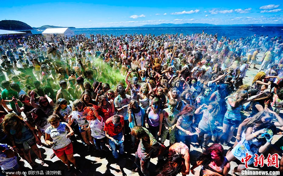 当地时间2013年8月31日,俄罗斯符拉迪沃斯托克,民众参加胡里色彩节庆祝活动。图片来源:CFP视觉中国