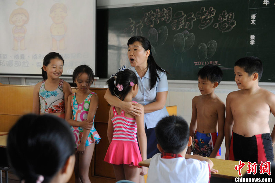 9月2日,广东中山西区翠景东方小学,老师给学生上防性侵课。“泳衣覆盖的地方不能让别人碰,即使隔着衣服碰也不行。如果有人要求你去碰他的这些部位,也不要理会,赶紧走开。”四年级(1)班的班主任韩少兰在给孩子们上防性侵的课程。为了让课堂更活跃,孩子们理解起来更容易,韩少兰还让几位同学穿上泳装,现场给孩子们讲解。吴进 摄 图片来源:CFP视觉中国