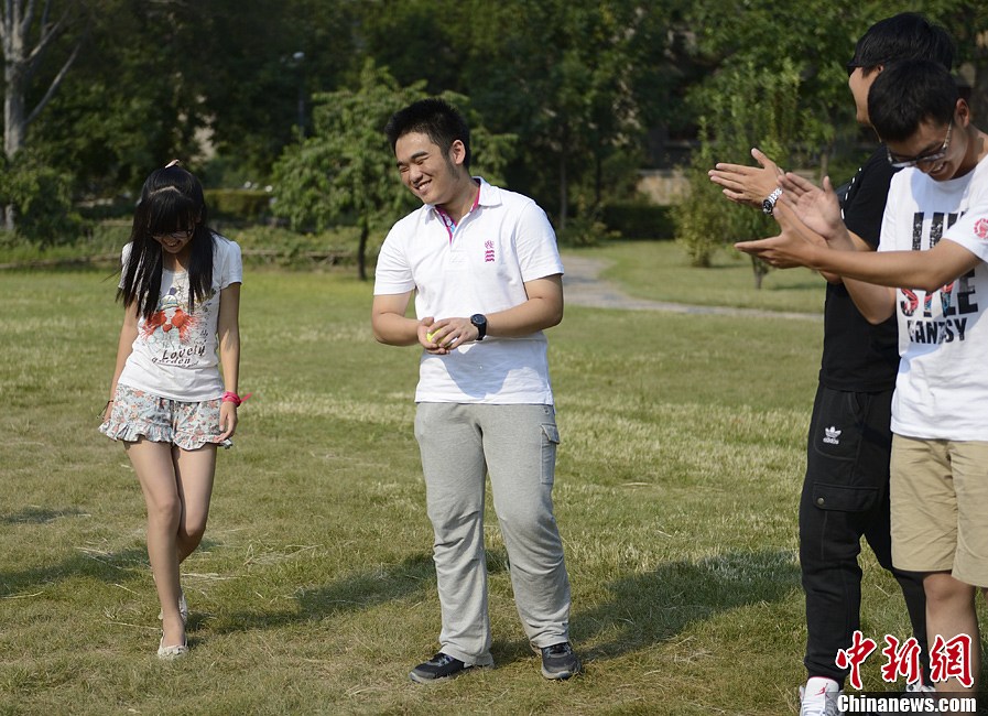9月2日,北京大学,大一新生在校园草坪上玩游戏,互相认识新的同学。中新社发 刘文华 摄