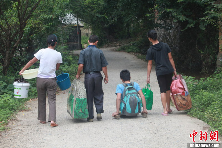 9月1日,张风背着书包在家人的陪同下,走在出村的路上,准备去学校报名注册读书。王滋创 摄 图片来源:CFP视觉中国