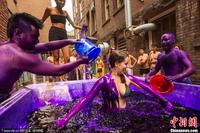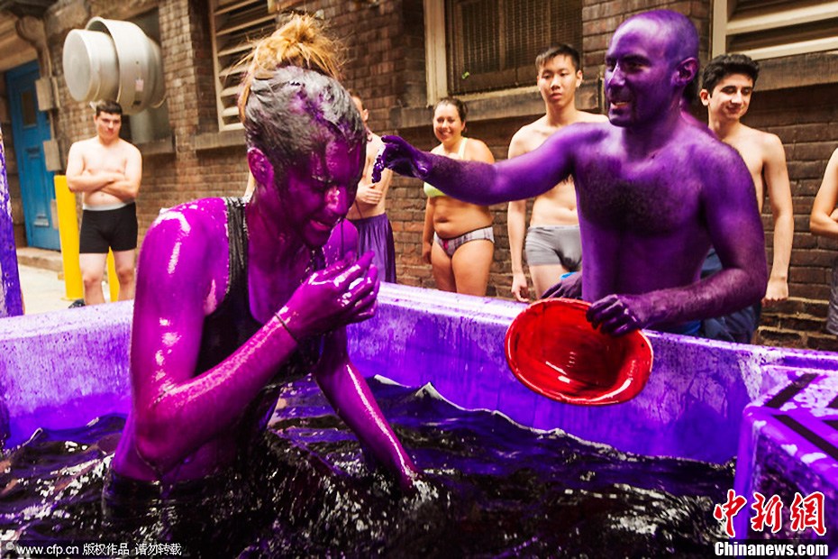 当地时间2013年9月2日,加拿大安大略省,多伦多大学的新生被涂成了紫色,快乐入学。染色将大约在一周左右的时间内消退。图片来源:CFP视觉中国