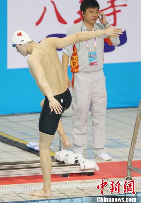 孙杨十二运首秀轻松晋级 向观众鞠躬不慎滑入泳池