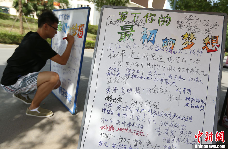 9月4日,南京航空航天大学新生报到第一天,一位新生在展板上写下“最初的梦想”。泱波 摄