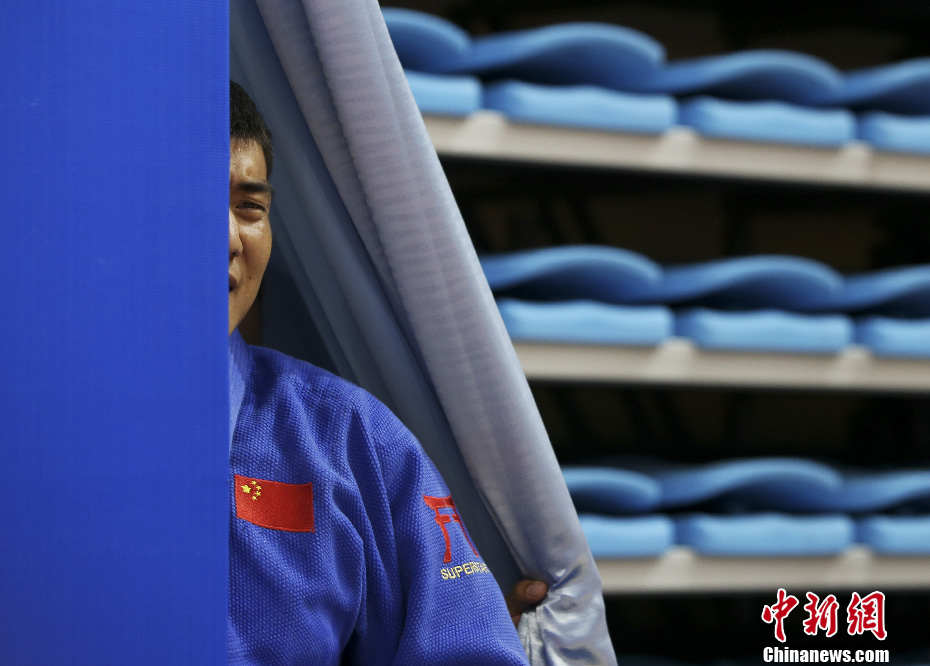 9月4日,解放军选手刘建在上场前观看其他场次的比赛。当日,他获得第十二届全运会柔道男子+100公斤级金牌。中新社发 刘关关 摄