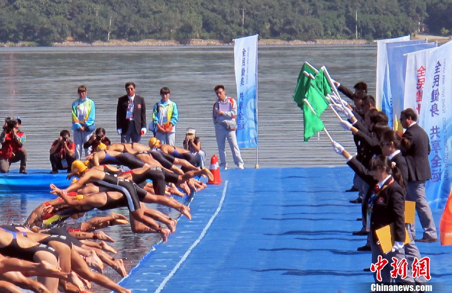 9月3日,全运会铁人三项女子决赛在风景秀丽的沈阳棋盘山赛场举行。铁人三项运动属于新兴综合性运动竞赛项目,比赛由天然水域游泳、公路自行车、公路长跑三项按顺序组成。经过激烈的拼搏,解放军队囊括金银铜三个奖牌,大获全胜。中新社发 任海霞 摄