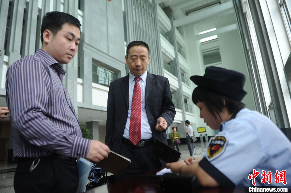 9月5日,备受关注的重庆不雅视频案件二审在重庆市第一中级人民法院不公开开庭审理。记者在重庆市第一中级法院见到赵红霞的代理律师张智勇。据张智勇介绍,赵红霞在一审宣判后没有提出上诉。但根据新刑事诉讼法323条规定“对同案审理案件中未上诉的被告人,未被申请出庭或者人民法院认为没有必要到庭的,可以不再传唤到庭”。图为赵红霞的代理律师(左二)进入法院。陈超 摄