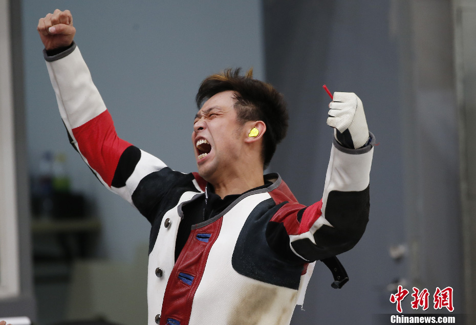 9月5日,第十二届全国运动会男子50米步枪三种姿势决赛在沈阳进行,朱启南在前两种姿势一直处于落后,但他凭借立射的出色表现实现逆转,最终夺取金牌。图为朱启南在比赛后庆祝胜利。中新社发 盛佳鹏 摄
