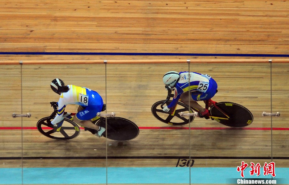 9月5日,第十二届全运会自行车女子场地争先赛在辽宁省体育局柏叶训练基地自行车馆举行。在1/2赛中经过3轮激烈角逐吉林郭爽三战两胜一负战胜上海钟天使,成功晋级。图为郭爽(左)在比赛中。中新社发 于海洋 摄