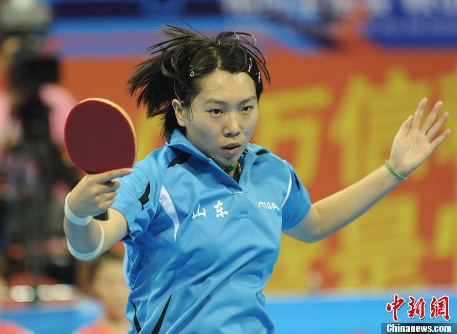 2013年9月5日,第12届全国运动会乒乓球女团决赛在鞍山奥体中心体育馆举行,山东队的李晓霞在比赛中。当日,山东队以3:0战胜山西队夺冠。中新网记者 李美多 摄
