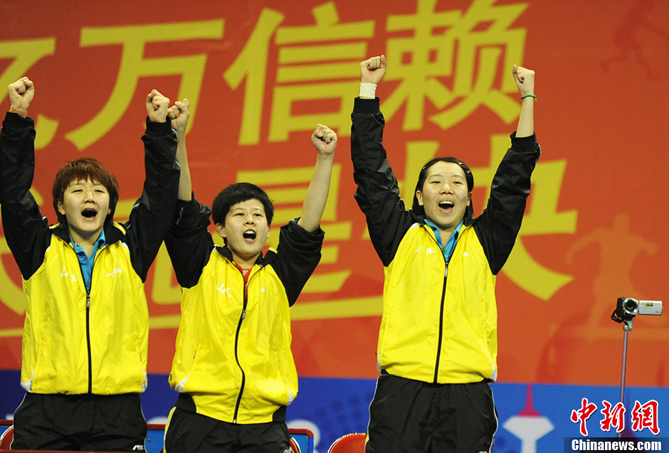 013年9月5日,第12届全国运动会乒乓球女团决赛在鞍山奥体中心体育馆举行,山东队庆祝夺冠。当日,山东队以3:0战胜山西队夺冠。中新网记者 李美多 摄