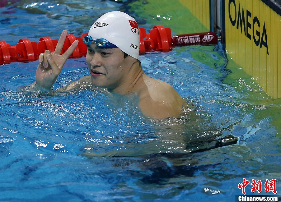 9月5日,在沈阳举行的第十二届全运会男子4x100米自由泳接力赛上,浙江队获得冠军。孙杨也赢得自己在本届全运会的第二金。中新社发 张家瑞 摄