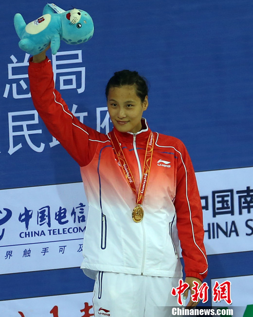 9月5日晚,第十二届全国运动会结束了游泳项目女子100米蝶泳决赛争夺,上海队陆滢获得冠军。中新社发 张家瑞 摄