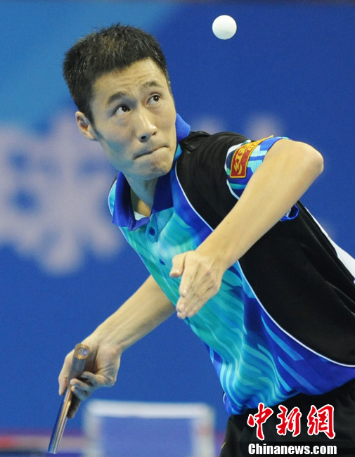 9月5日晚,第十二届全运会乒乓球男团决赛在辽宁鞍山举行,上海队的王励勤战胜解放军队的樊振东。最终,上海队以1:3不敌解放军队获得亚军。中新网记者 李美多 摄