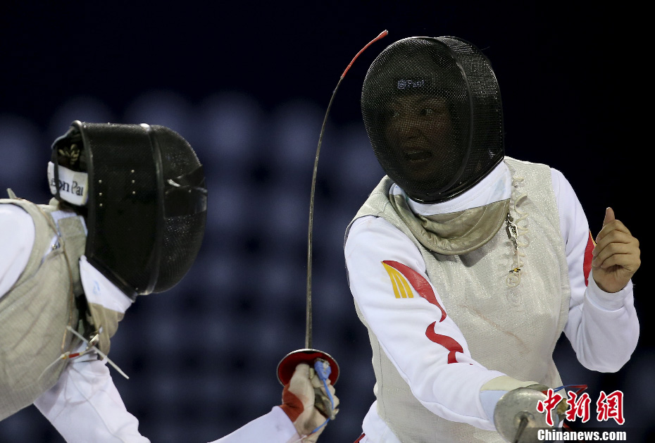 9月5日,上海选手(右)与福建队选手在第十二届全运会女子花剑团体第三、四名争夺中对阵。当日,上海队获得第十二届全运会女子花剑团体铜牌。中新社发 刘关关 摄