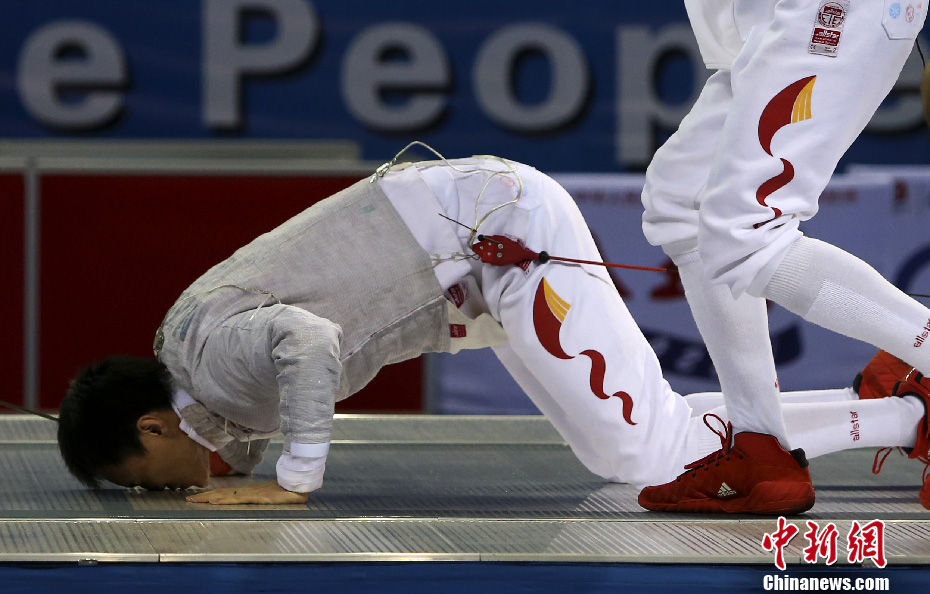 9月5日晚,江苏选手仲满在赛后亲吻赛道。当日,在第十二届全运会男子佩剑团体决赛中,仲满领衔江苏队出战,终以一枚团体金牌抚平几日前无缘个人决赛的遗憾。中新社发 刘关关 摄