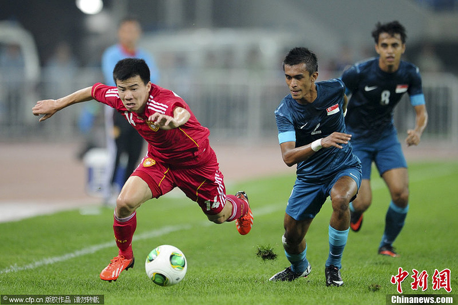 9月6日,中国男足热身赛在天津举行,中国队凭借张稀哲、武磊、郑龙、于大宝等人出色的发挥,最终以6:1大胜新加坡队。周五疯 摄 图片来源:CFP视觉中国
