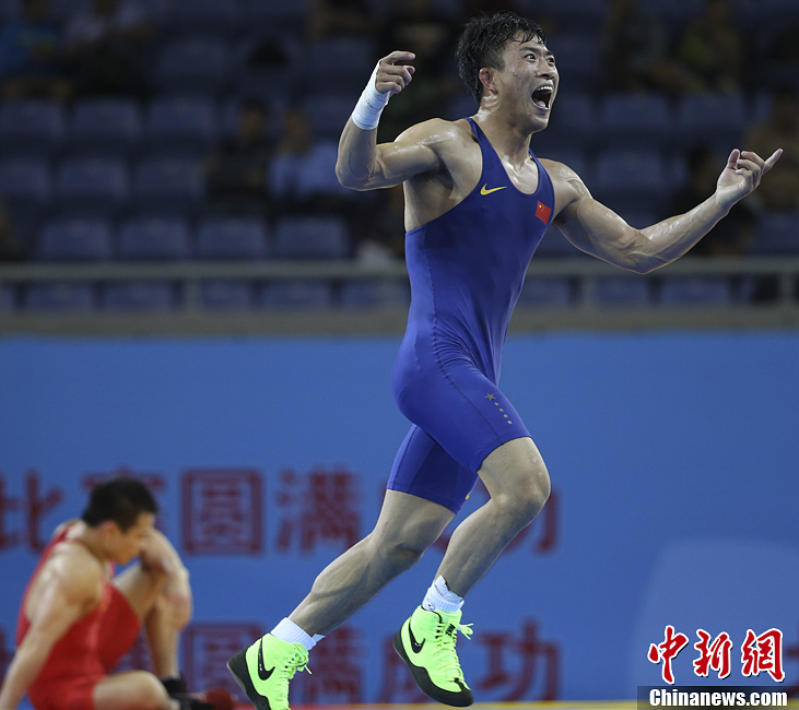 9月6日,第十二届全运会男子古典式摔跤66公斤级决赛在沈阳进行,山西选手闫鹏飞(蓝)在比赛中战胜湖北选手郑攀(红)夺得金牌。图为闫鹏飞庆祝胜利。中新社发 盛佳鹏 摄