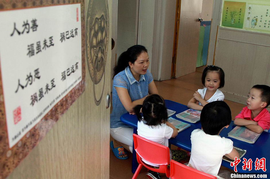 9月9日,位于江西师范大学附近的一家私塾学堂内,几十名低龄儿童端坐在矮凳上,随老师朗读《孝经》、《弟子规》等。近年来,低领学童个性化教育受内地家长亲睐。据这家私塾学堂的负责人王烁哲介绍,近年来,热衷私塾教育的家长明显增多,自己创办的学堂已由最初的4名学生上升至40余人。私塾产生于春秋时代,是古时私人开设的教育机构,强调在孩童启智阶段,传授其民族传统经典文化,养成良好的道德品质与生活习惯。姜涛 摄