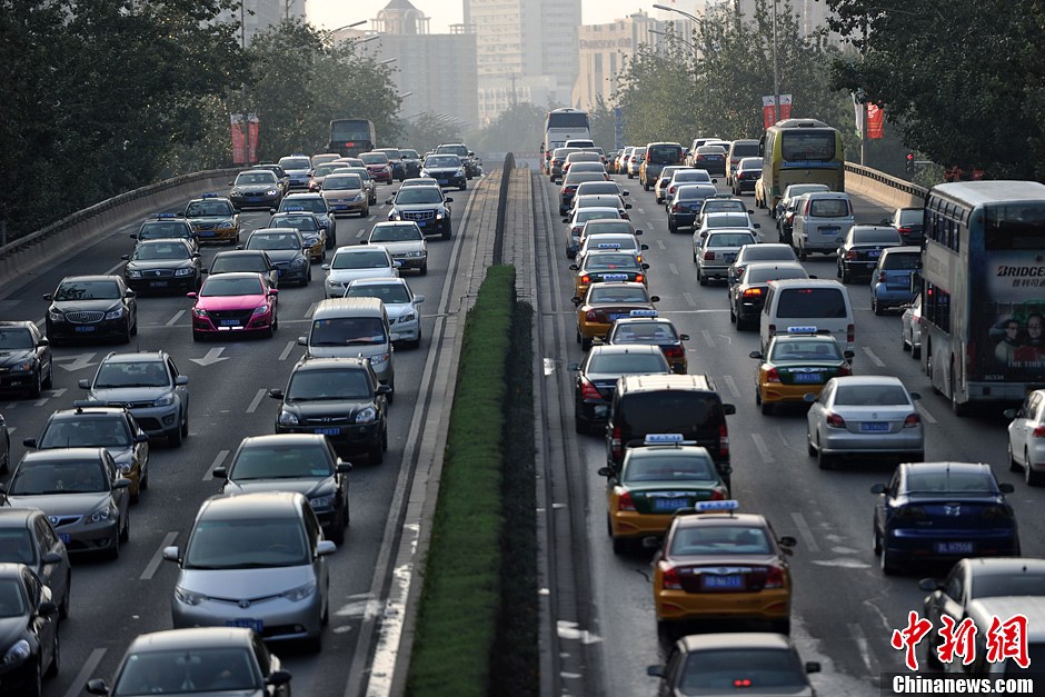 9月11日晚,北京东三环、东二环等环路路网车辆行驶缓慢。近日,北京迎来年内“最堵”月,北京市交通委在前期广泛征求意见的基础上出台《2013年9月缓解交通拥堵专项行动方案》。《方案》提出,9月有9个重点拥堵日,这几天各企事业单位可实施弹性工作时间。据测算,9月将有9个拥堵日达严重拥堵等级,其中17日、18日、22日、29日高峰交通指数预计超过9.0。2010年中秋前最后一个工作日的晚高峰拥堵指数就达9.0,全市交通几乎瘫痪。中新网记者 金硕 摄