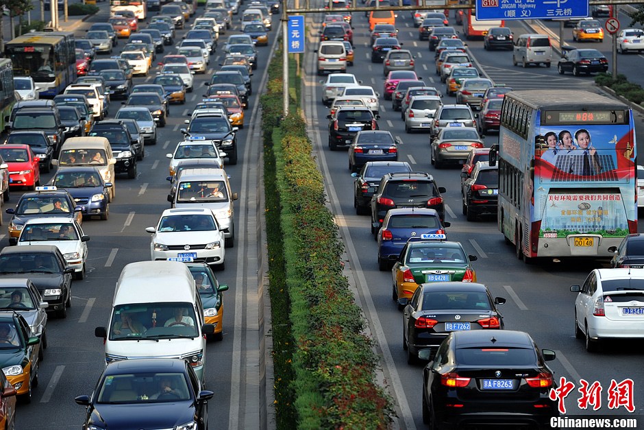 9月11日晚,北京东三环、东二环等环路路网车辆行驶缓慢。近日,北京迎来年内“最堵”月,北京市交通委在前期广泛征求意见的基础上出台《2013年9月缓解交通拥堵专项行动方案》。《方案》提出,9月有9个重点拥堵日,这几天各企事业单位可实施弹性工作时间。据测算,9月将有9个拥堵日达严重拥堵等级,其中17日、18日、22日、29日高峰交通指数预计超过9.0。2010年中秋前最后一个工作日的晚高峰拥堵指数就达9.0,全市交通几乎瘫痪。中新网记者 金硕 摄
