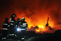 9月11日晚间,成都市双流县九江镇一个物流仓库发生大火,现场浓烟滚滚,过火面积约3000平方米。火灾发生后,成都市消防支队调集大批消防官兵和消防车奔赴火场,当地紧急疏散了火场周边民众和切断了电源。目前,大火已得到控制,暂无人员伤亡。图为消防官兵深入火场展开灭火。中新社发 刘忠俊 摄