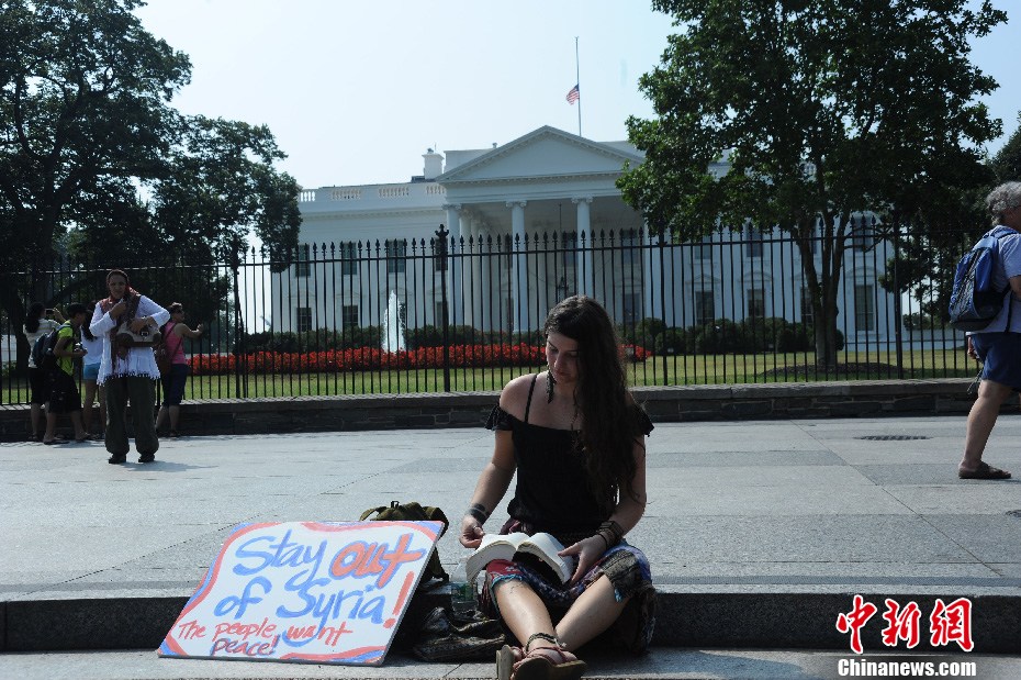 2013年9月11日是美国“9·11”恐怖袭击事件12周年纪念日,图为当日白宫降半旗致哀,民众在白宫前平静抗议对叙动武。中新社发 张蔚然 摄