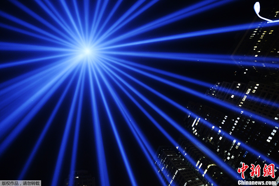 当地时间2013年9月11日,美国纽约曼哈顿世贸遗址,巨型光柱投射在夜空中,纪念9·11事件12周年。
